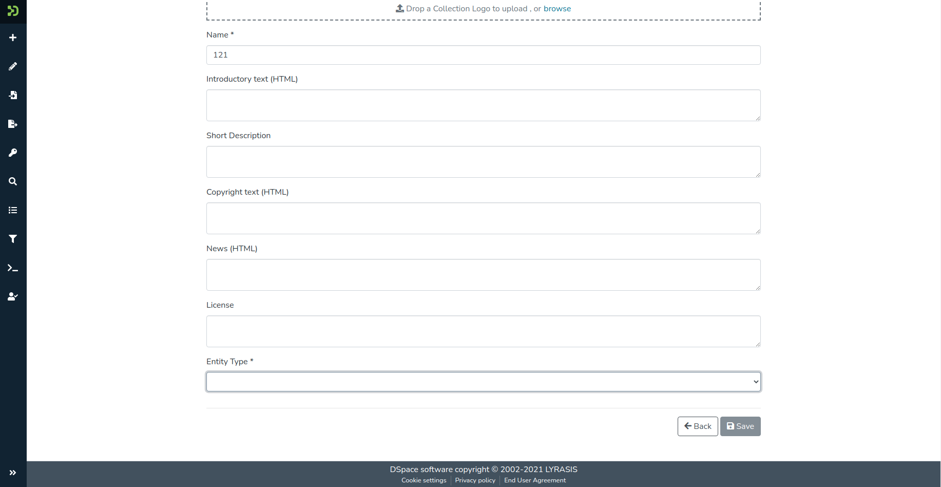 - In the UI, Collections are required to have an Entity Type. This is incorrect. Entity Type should be optional (In fact, if Entities are NOT enabled/initialized on the backend, this dropdown should not even display.). If unselected, then the