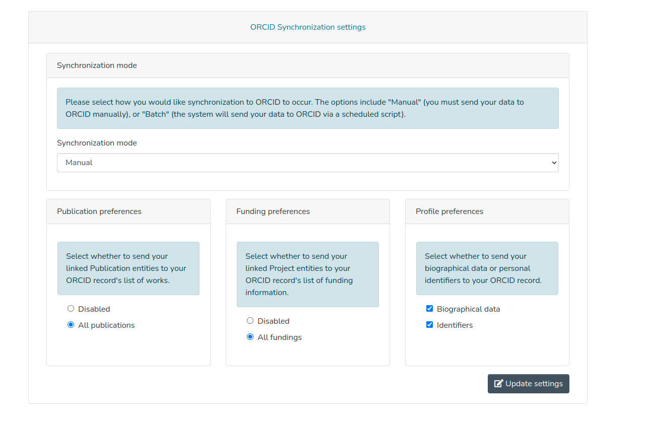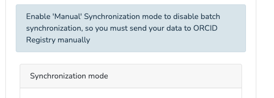 Please select how you would like synchronization to ORCID to occur. The options include "Manual" (you must send your data to ORCID manually), or "Batch" (the system will send your data to ORCID via a scheduled script).
