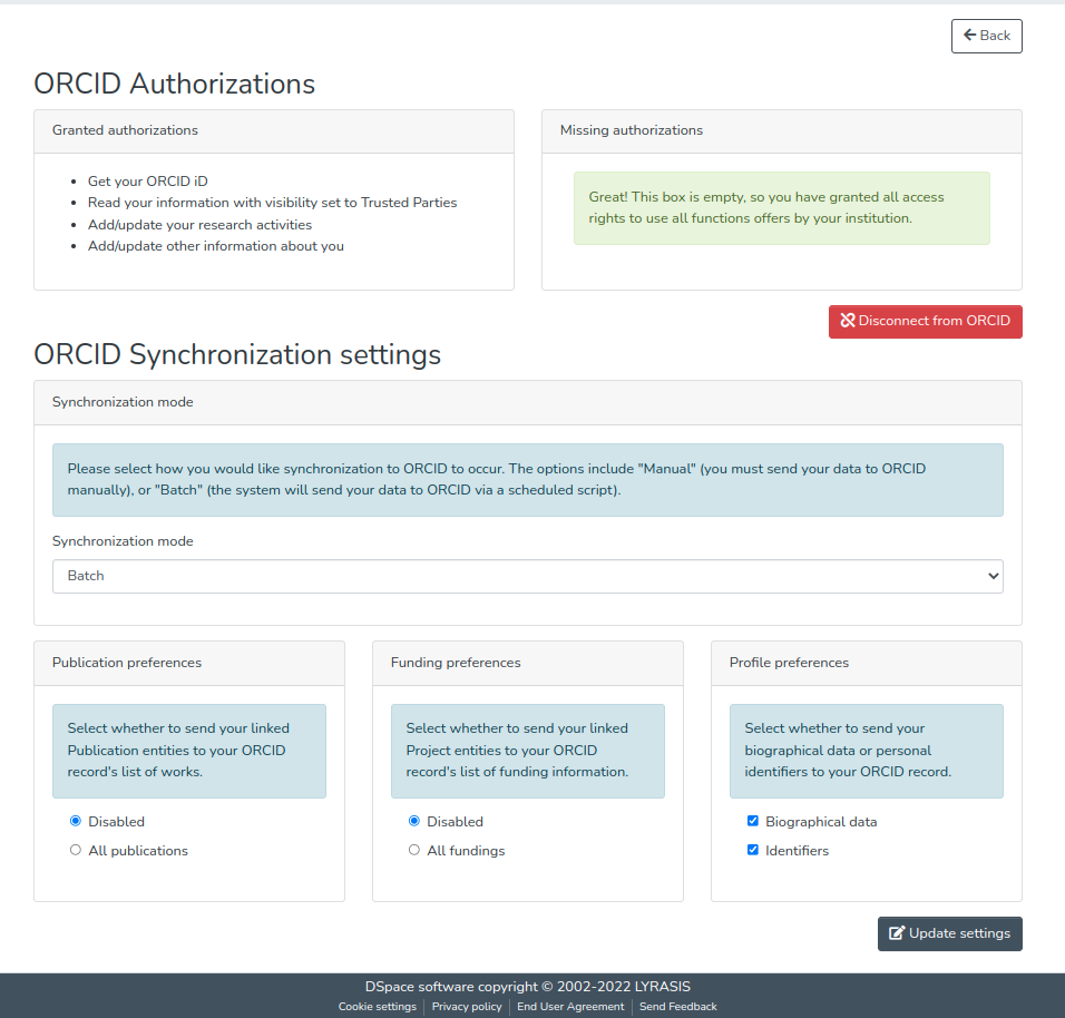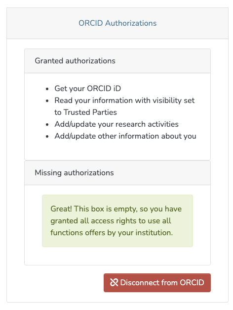 - Go to the Orcid settings page (/orcid)