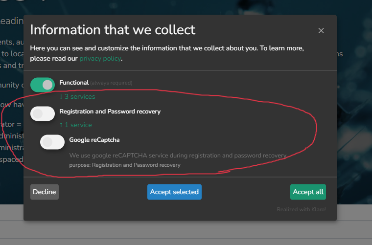 - Open up UI in Incognito mode. Check the Klaro popup and you'll still see reCaptcha listed: