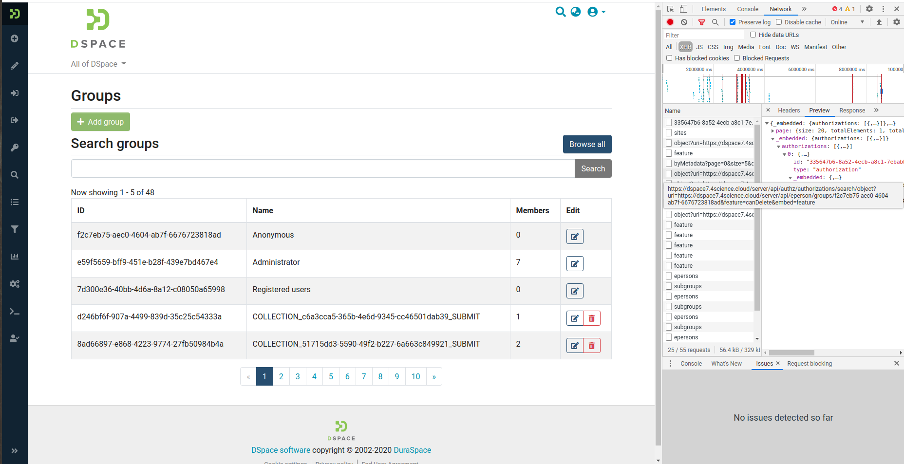 http://localhost:8080/server/api/eperson/groups/newGroup(which doesn't exist in the REST API, as the "/newGroup" path is a UI-level path). Everything still works though, you can create a new group - From the list of Groups (/access-control/groups) click the Delete button. This triggers three 404 Reponses, all related to the group you just deleted, as that group's