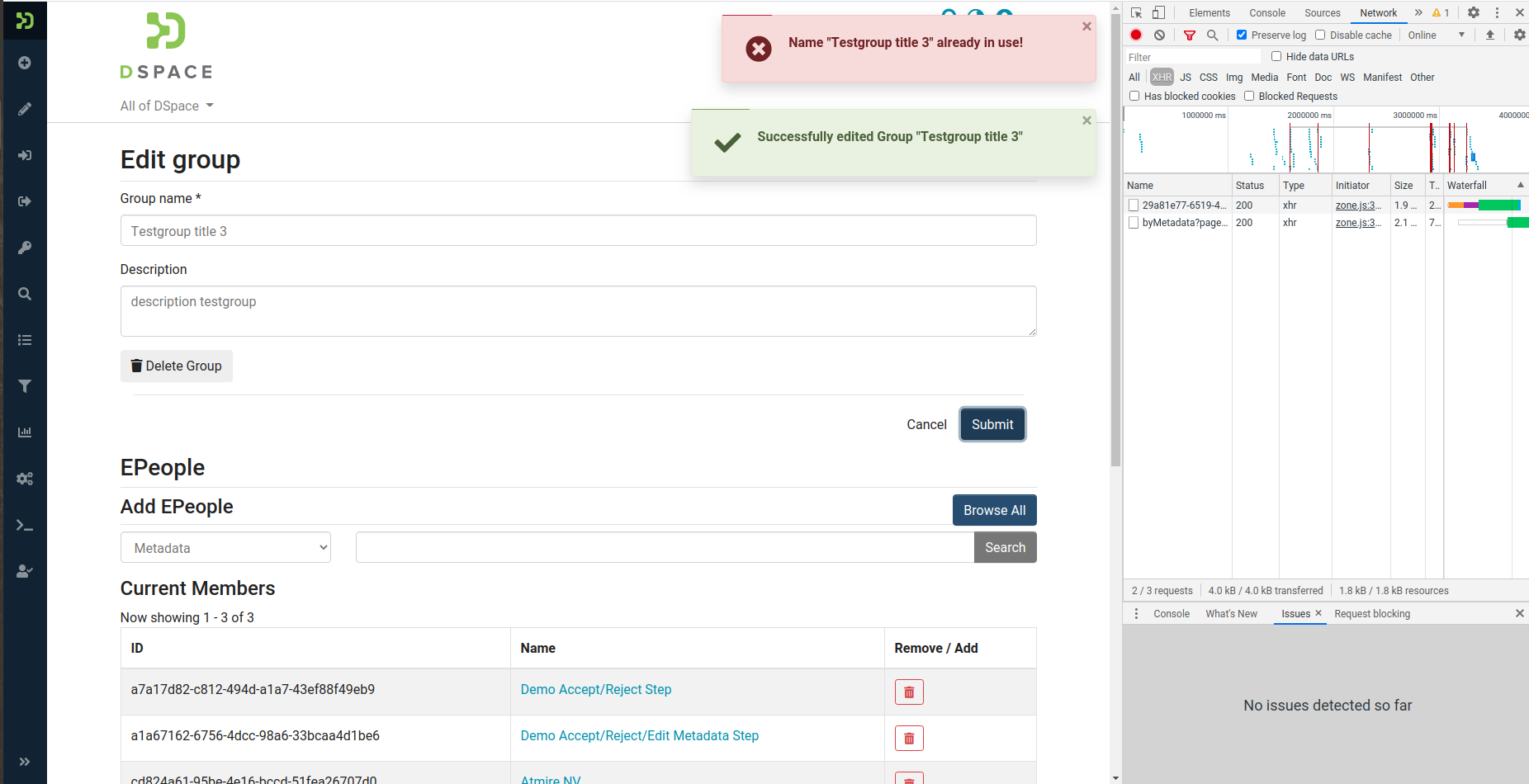 I recreated the issue where both success and nameInUse error message was shown. NameInUse was meant to check if there was a group found with the same name as the one being attempted, but it just used a search on name => inUse if totalElements of result > 0, but the search isn’t on exact name. Example: So when you rename a group to Test, it will succeed if Test name is not already in use, but the nameInUse check showed error because for example Test 2 group existed, and got returned with search ‘Test’. It would be slow to check for all the groups in the search result if their names is an Exact match to the one we are attempting, since could be great number of results, and there is not an endpoint for get group by exact name… (Implemented a similar check with eperson with email but the search there with scope email is exact I believe) A patch request with a group name that is already in use results in a 500 Internal Server error response with a stack trace (javax.persistence.PersistenceException: org.hibernate.exception.ConstraintViolationException: could not execute batch), which can’t really be used to form a meaningful message as to Why your edit request failed. The check has been removed for now since as it is now it is not guaranteed to be correctly shown, and the only way for it to be correctly shown would be to check each search result group for an exact name match… |