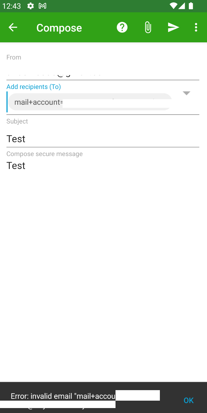 A user cannot send an email to an email address when using the FlowCrypt android app while sending the message using Gmail web app works.