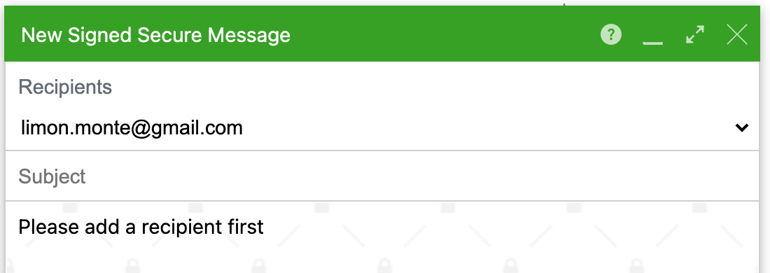 - Open Secure Compose window and click the "Send" button, the "Please add a recipient first" modal will be shown