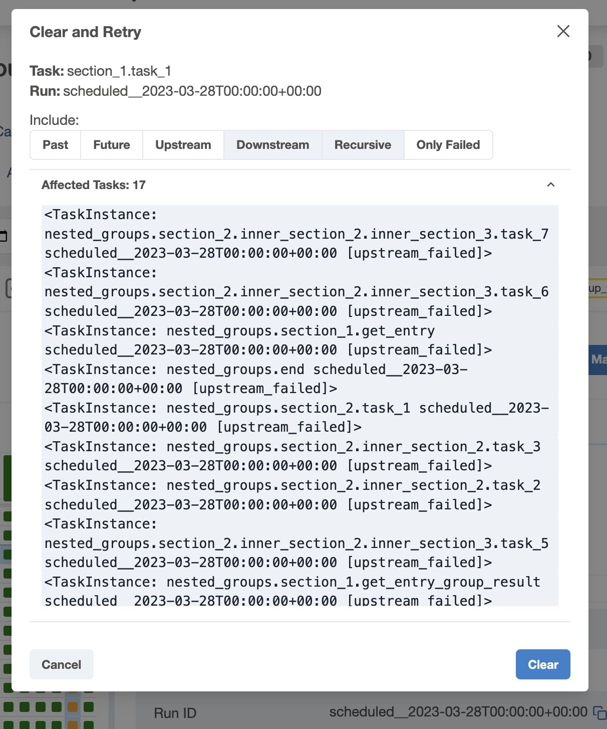 * update run clear+mark, update task clear * add mark as tasks and include list of affected tasks * Add support for mapped tasks, add shared modal component * Clean up styling, restore warning for past/future tg clear (cherry picked from commit c5b685e)
