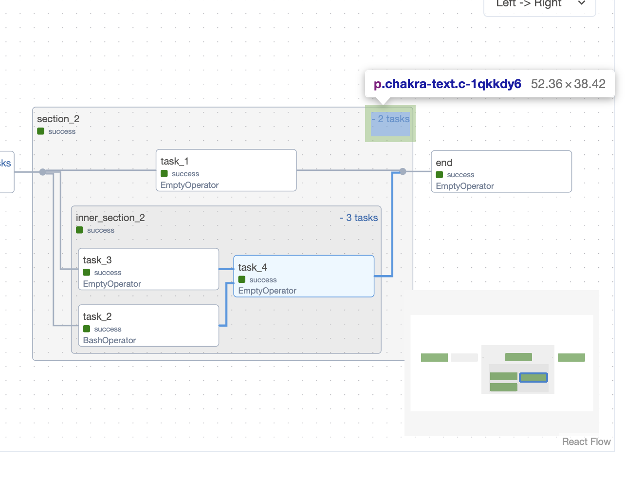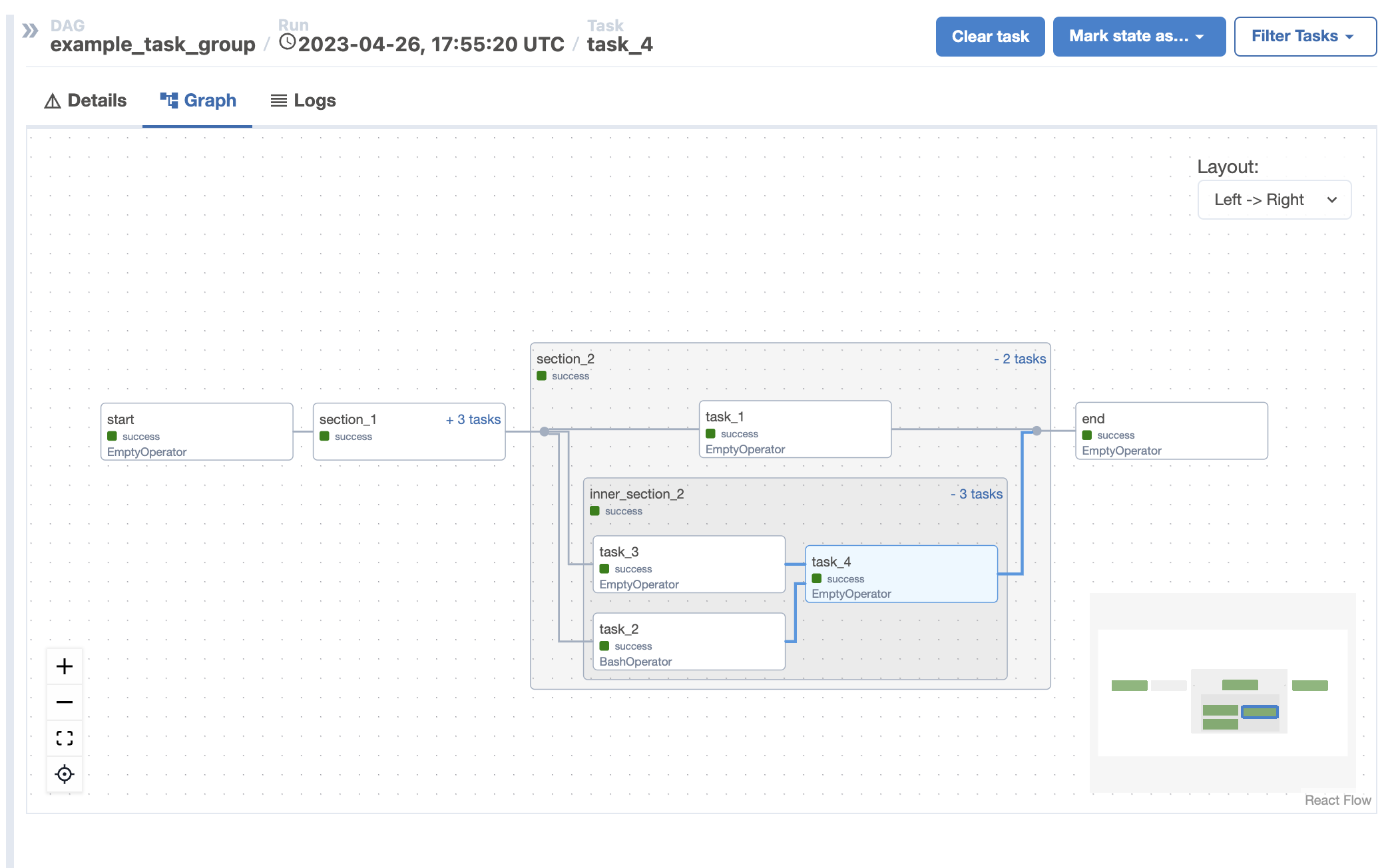 Yes, looks clearer now 😄. Now it's easier to differentiate between a task and a Taskgroup. I suppose having colors for each task could also be useful, specially with many tasks in a Taskgroup. E.g. Finding a random Operator between plenty of python Operators, can be hard since all have the same white background. Another function related to Taskgroups that I don't know if it is working as intended is the clears. For example, if you filter upstream to see better some part of a DAG, and then want to clear some tasks, I see 3 possible options: