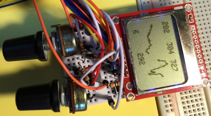 Continuously plots the data from an analog port on a Nokia 5110-style graphic LCD display. 2 potentiometers can change the value that centers the Y axis (default: 512) and its amplitude (default: 1024). A button auto selects the best center and amplitude based on recent data history.