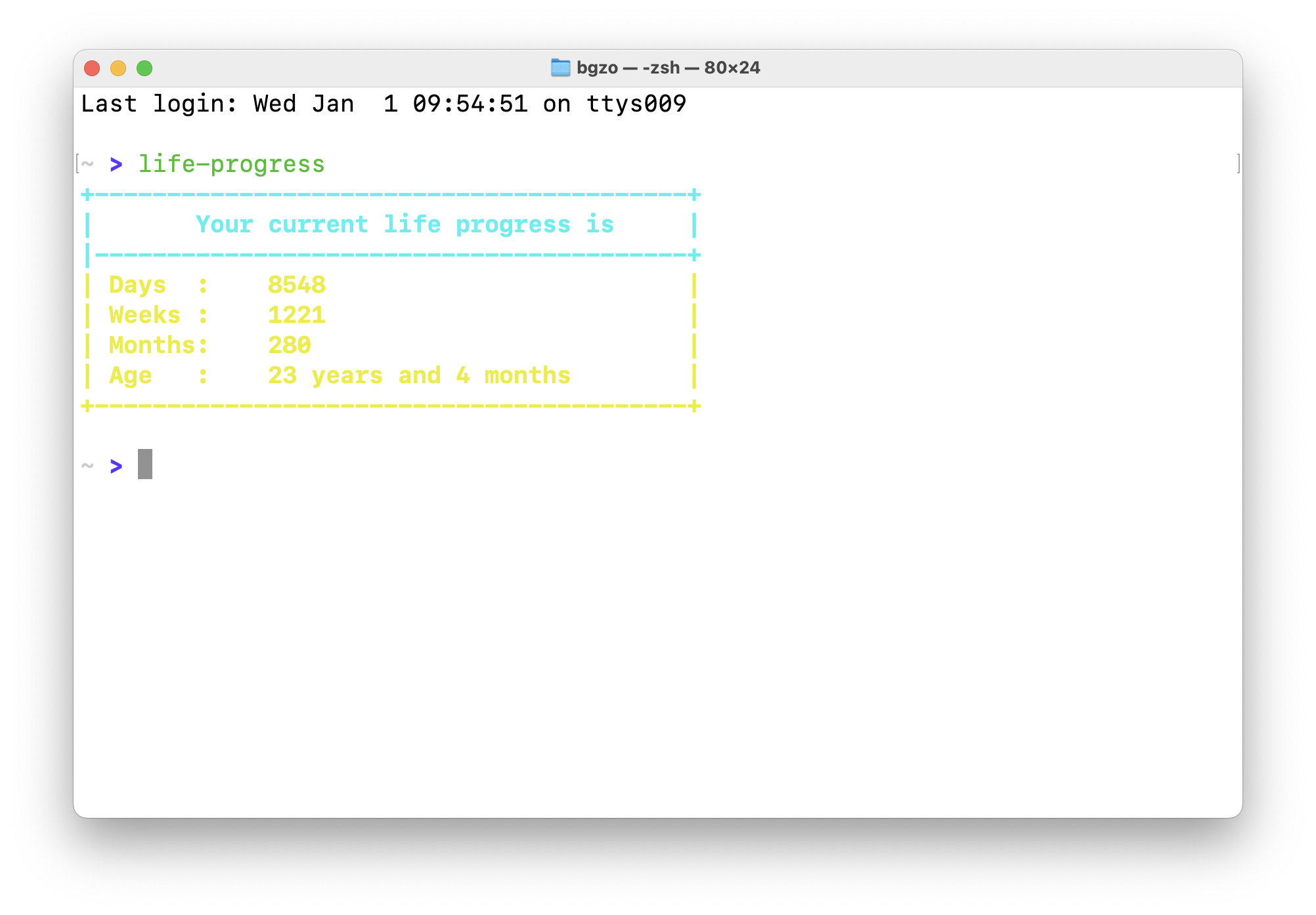 A simple zsh plugin to show your life progress in days, weeks, months, and age.