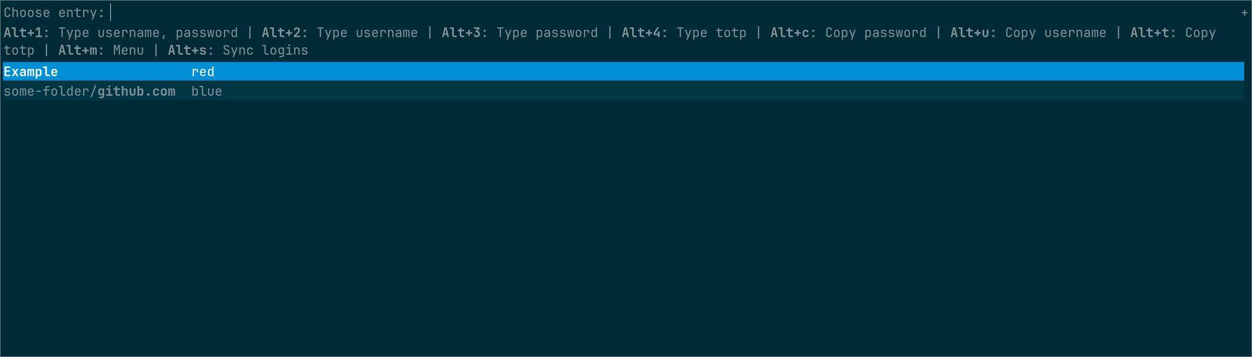 Define custom keybindings in the format <shortcut>:<action>:<target>, for example Alt+x:copy:username. Multiple keybindings can be concatenated with ,; multiple targets for one shortcut can be concatenated with :. Note that wofi and fuzzel don't support keybindings. |
