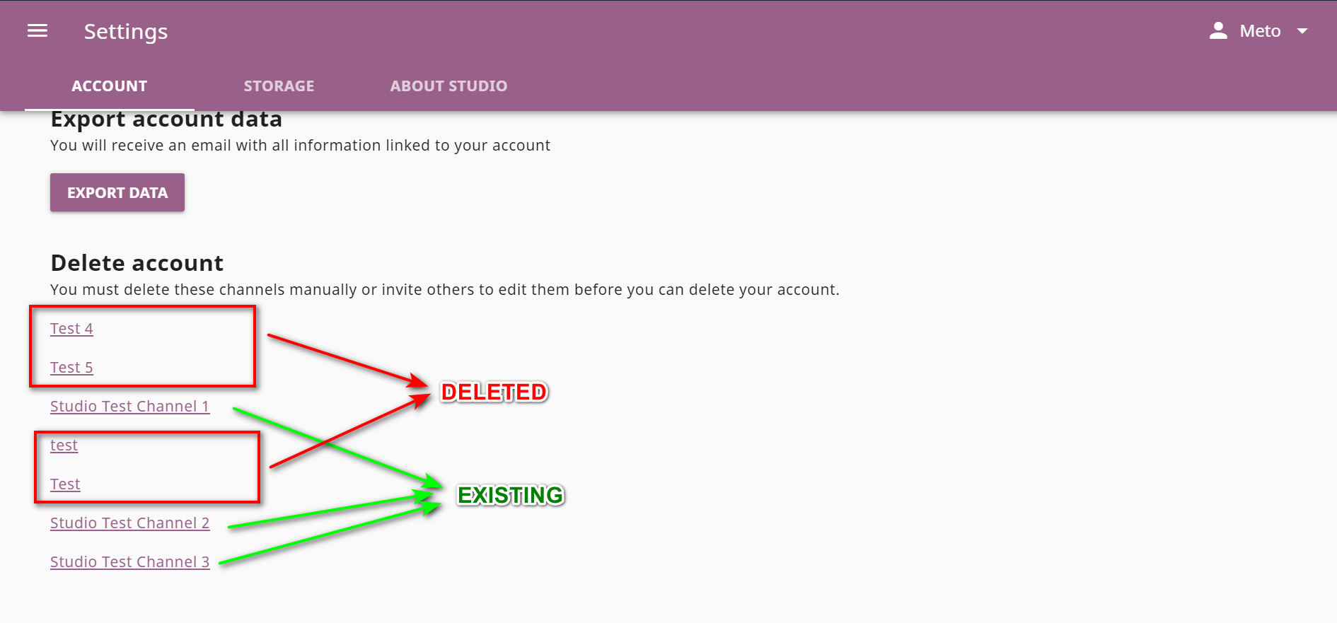 All the deleted channels are visible in the Account > Delete account section.