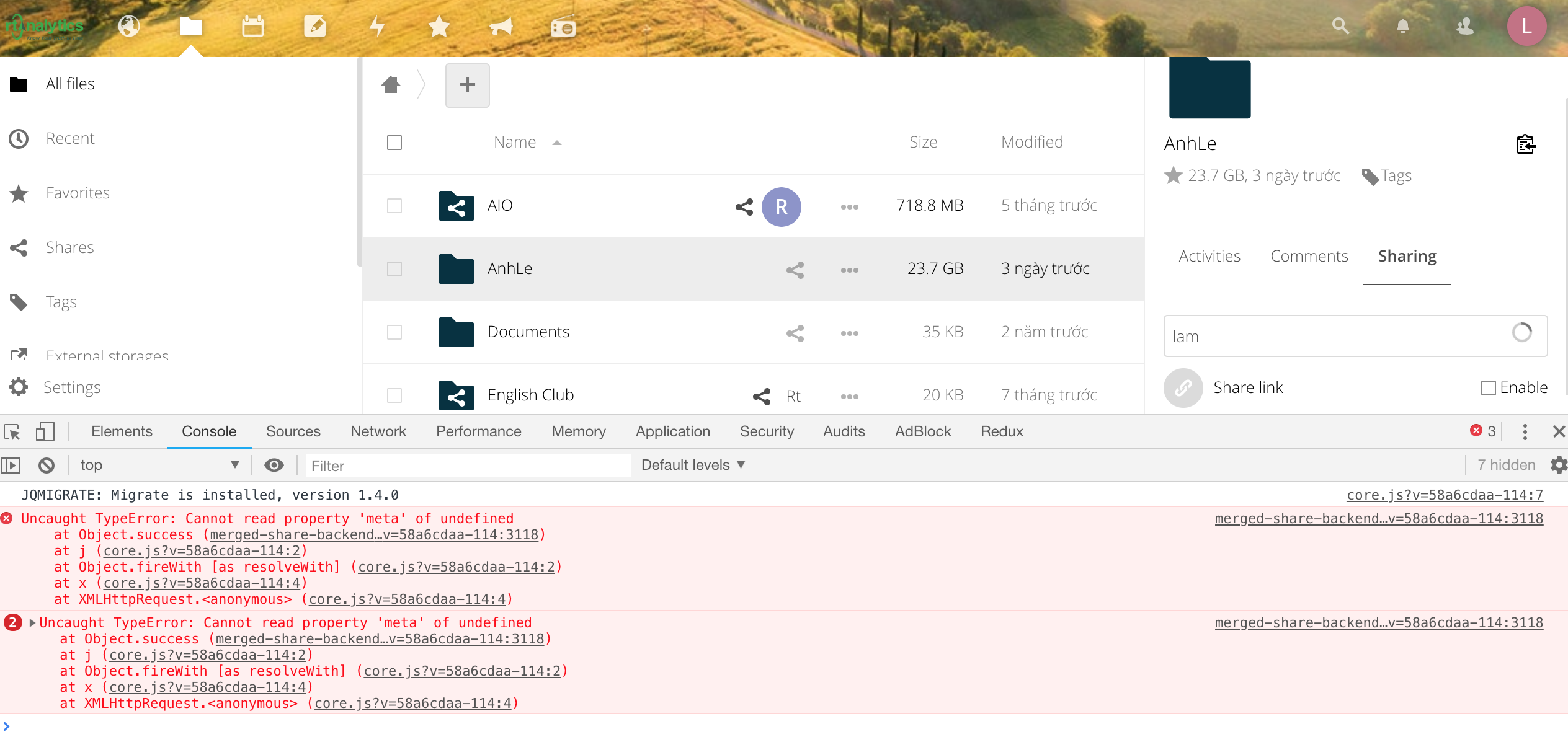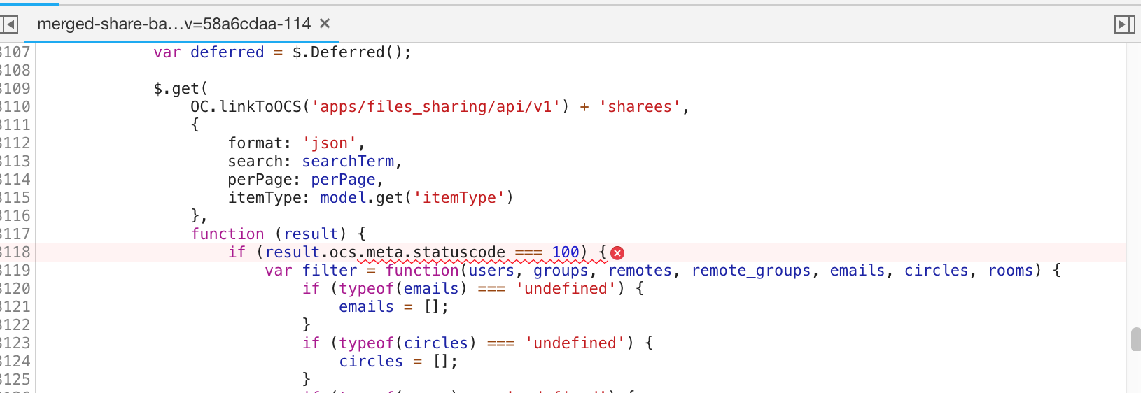 Nextcloud version 14.0.3, when I search for any user in Sharing, has an error: Can not read property 'meta' of undefined. Can anybody help me, thanks! <img width="1264" alt="screen shot 2018-11-09 at 9 05 32 pm" src="https://user-images.githubusercontent.com/7877646/48267038-c1da3b00-e463-11e8-80a1-1c363e046969.png"> <img width="815" alt="screen shot 2018-11-09 at 9 07 38 pm" src="https://user-images.githubusercontent.com/7877646/48267039-c272d180-e463-11e8-82c3-3a0aed1bf5db.png">