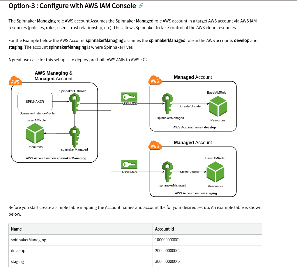 the instructions allow Spinnaker operators to deploy to AWS Accounts develop and staging. arranged the wording of the instructions.