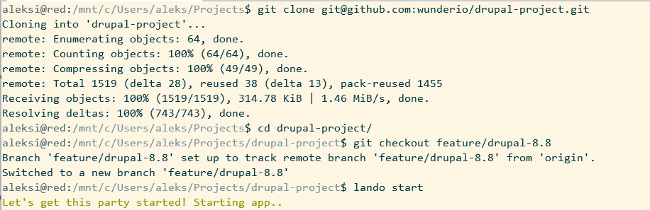 git clone git@github.com:wunderio/drupal-project.git && cd drupal-projectgit checkout feature/drupal-8.8lando start